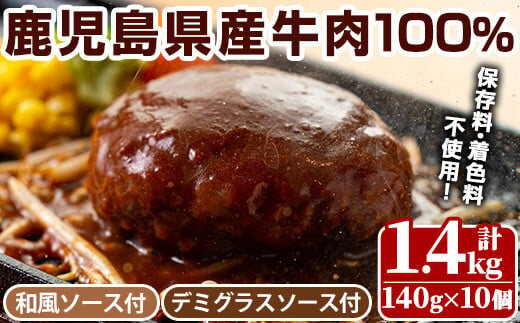 No.877 ハンバーグ専門店のふんわりジューシーハンバーグ(計1.4kg・約140g×10個)!ソース2種付(デミグラス・和風) 国産 九州産 鹿児島県産 牛肉 お肉 ハンバーグ デミグラス 和風 ソース おかず 冷凍 冷凍ハンバーグ【レストラン プチ・ポア】【405】
