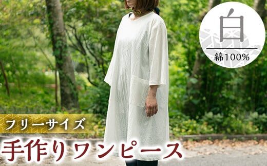 C5-011 手作りワンピース(白)綿100%【樫の木】霧島市 ワンピース 洋服 レディース 綿 100% 軽い シンプル フリーサイズ アイロン不要 ホワイト 白 ハンドメイド 手作り