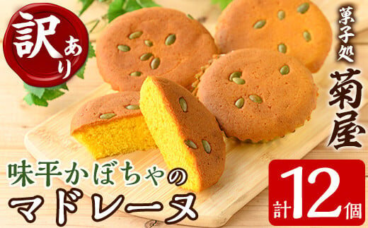 <訳あり>ご自宅用!味平かぼちゃのマドレーヌ12個入り! 特産 の 味平かぼちゃ は 糖度が高く 濃い甘味が特徴 で ビタミン類 や 食物繊維 も 豊富!【A-1830H】