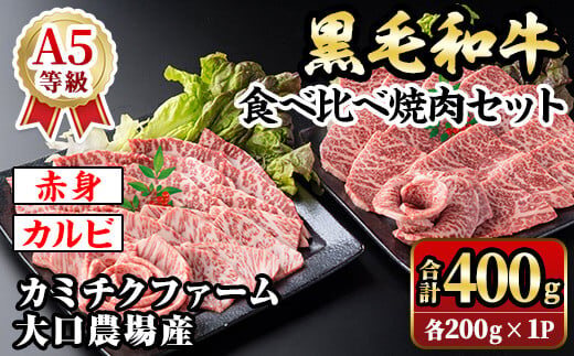isa688 鹿児島県(カミチクファーム 大口農場)産 黒毛和牛食べ比べ焼肉セット(合計400g・赤身・カルビ各200g×1パック) 黒毛和牛 焼肉 食べ比べ セット 和牛 A5 ランク 雌牛 霜降り 赤身 肩 カルビ モモ バラ 牛肉 アウトドア 小分け 冷凍 【お肉の直売所 伊佐店】