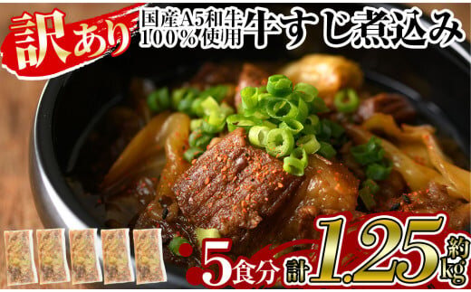 a822 《訳あり》国産A5等級和牛100%牛すじ煮込み合計1.25kg(250g×5食分)【やまさき】姶良市 牛筋 牛すじ 煮込み おかず 惣菜 おつまみ 時短調理 国産和牛 セット 冷凍