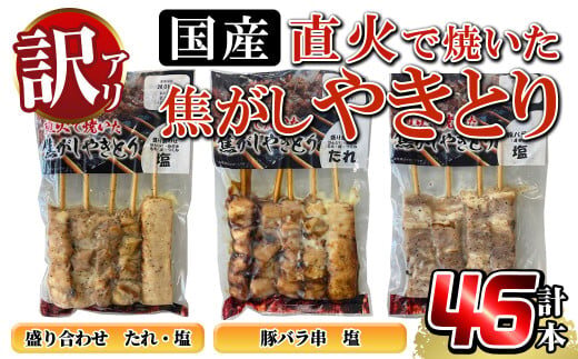 a1030 【数量限定】《訳あり》国産!直火で焼いた焦がしやきとり(盛り合わせ・たれ)(盛り合わせ・塩)(豚バラ串・塩)【計46本】【フタバフーズ】姶良市 鶏肉 鳥肉 焼鳥 やきとり もも ねぎま 皮 ぼんじり つくね 豚バラ タレ 塩 セット 小分け 加工品 総菜 おかず