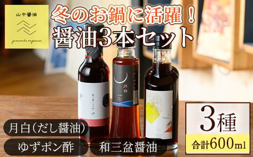 【0104908a】冬のお鍋に活躍する醤油3本セット(合計3本) しょうゆ しょう油 正油 調味料 常温保存 出汁 だし ポン酢 ぽん酢 和三盆 ゆず 柚子 【山中醤油】