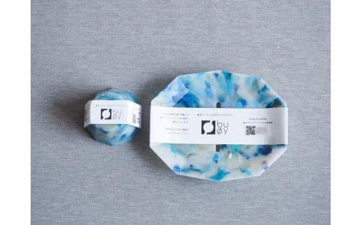日本のプラスチックメーカー株式会社テクノラボが開発した技術で生まれた海洋プラスチックごみのアップサイクルブランドbuoy(ブイ)により一つ一つ手作業で製造されています。