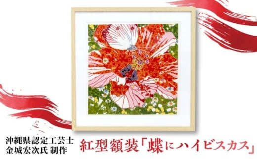 【宏次染工房 / 沖縄県認定工芸士 金城宏次】紅型額装 『蝶にハイビスカス』 絵画 額入り 伝統工芸品 おしゃれ 沖縄市 / コザ工芸館ふんどぅ [BCAU008]