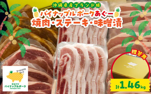 沖縄が誇るアグーブランド豚の一つである「パイナップルポークあぐー」の焼肉・ステーキ・みそダレ漬けセット(1.46kg)を<ギフト専用>でご用意いたしました。