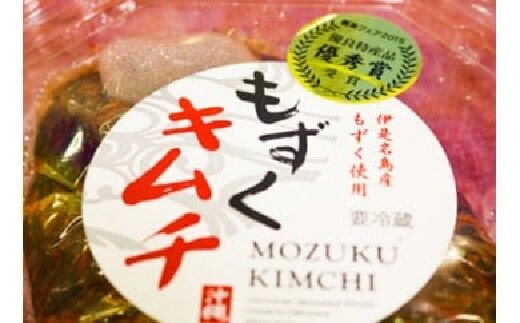 離島フェア2015優良特産品「優秀賞」を受賞しました!伊是名産の太もずくの食感とキムチの甘辛さがベストマッチでやみつきになる商品です。お好みでキュウリやレタスと和えたり、鍋物に入れたり、お酒のおつまみ等にもおいしく召し上がれます。